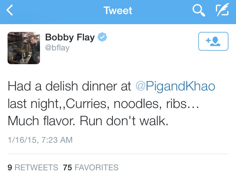 The next morning I woke up and did my usual social media once-over. When I checked my Twitter account, I quickly came upon a tweet Bobby had posted about his meal at Pig and Khao the previous night!