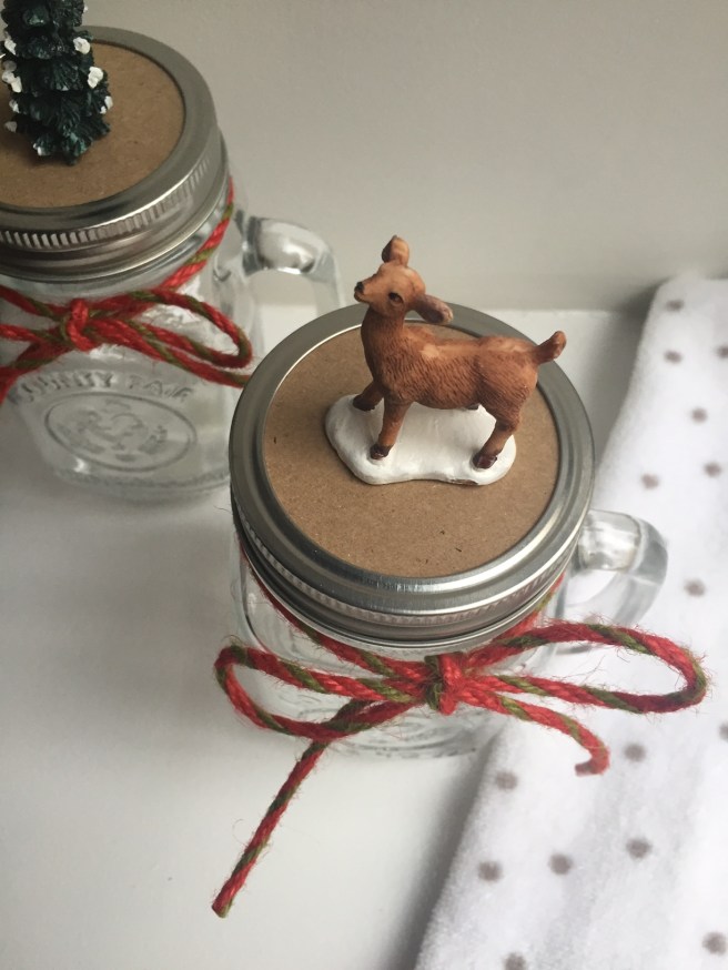 To make the jars, go to your local craft store and purchase small to medium glass mason jars. I bought these at Michael’s for 3 dollars each. Also buy some festive figurines for the top and ribbon to tie into a bow. I found a pack of four holiday figurines at Michael’s for 5 dollars and the ribbon for 99 cents.