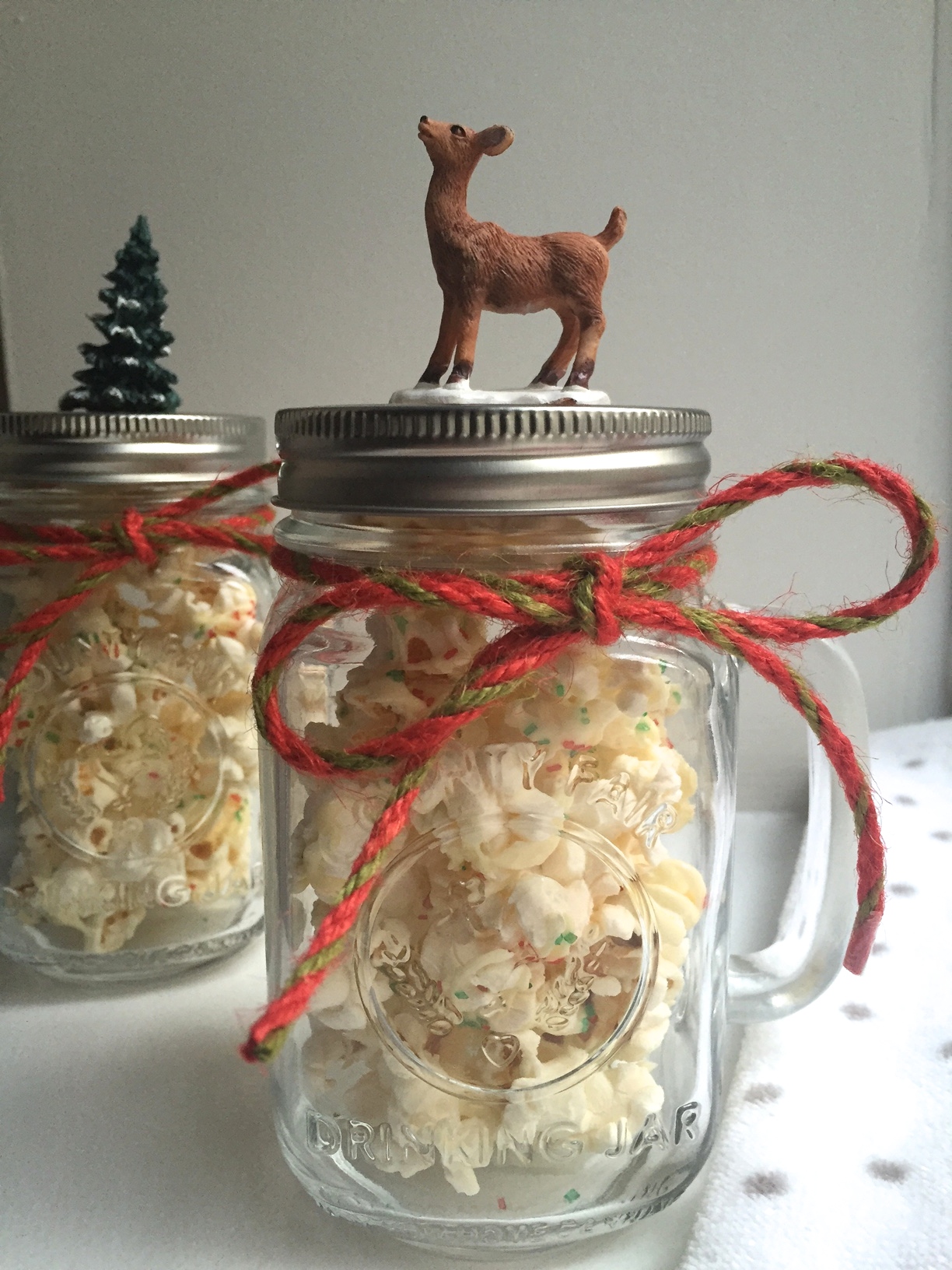 Once your jars are finished, fill them with homemade edible snacks your friends and family can munch on. I made and filled the mason jars with some white chocolate holiday popcorn. Check out the recipe for White Chocolate Holiday Popcorn here. You could also make spiced nuts, small shortbread cookies, or any small treat to fill your jars.