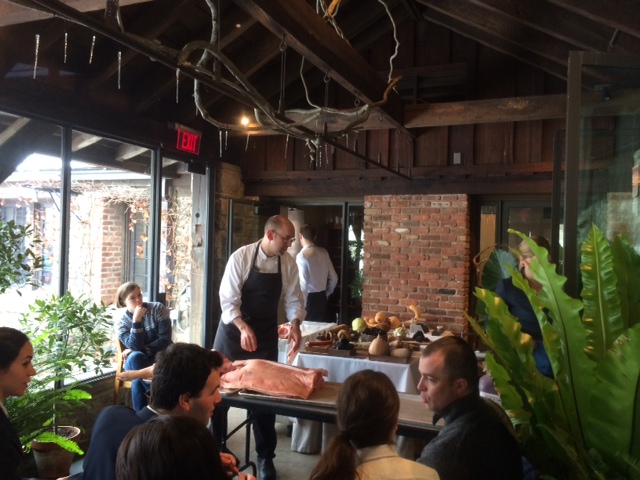 When we arrived, we were greeted with a warm welcome from Irene Hamburger and quickly whisked away to take a tour of the farm. It was surprising to see a greenhouse stocked full of produce in the dead of winter. We even pulled “survivor spinach” right out of the ground and tasted it, and it was delicious! After the tour we had lunch at the Blue Hill Café and had a meet-and-greet with some very influential individuals in the culinary world. We closed out the day with a charcuterie lesson from Vice President of Culinary Affairs, Chef Adam Kaye. He went through all the different cuts of pork, and even gave us a few tastes of ham and speck. We all had an amazing time, and are now more excited than ever to spend a week perfecting our cooking skills at Blue Hill this June.
