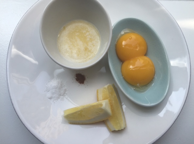 2) In a medium sized metal bowl, whisk together egg yolks, lemon juice, and hot water. For a quicker sauce, use a large balloon whisk (your arm will thank you).