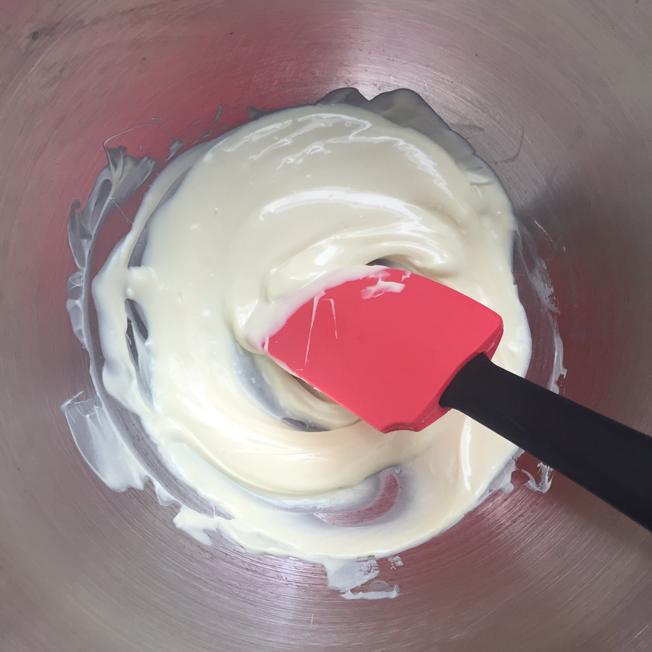 Add the chocolate pieces to the bowl and begin to stir with a rubber spatula. Make sure to give the chocolate a good stir every 30 seconds or so, so the chocolate can melt quickly and evenly. Once the chocolate has completely melted, turn off the heat, remove the bowl from the sauce pot, and set aside to cool slightly.
