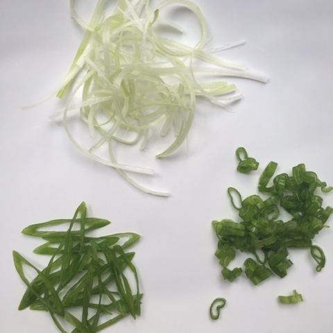 First lay one scallion stalk horizontally on a cutting board. Starting at the top end of the stem, begin to make parallel slice with your knife. You can make the slice size as big or as small as you wish, but a smaller slice will provide a less intense onion flavor. Continue to make small cuts down to the white portion of the scallion and stop. The dark and light green parts of the scallion are best for this type of scallion slice. And that’s it!
