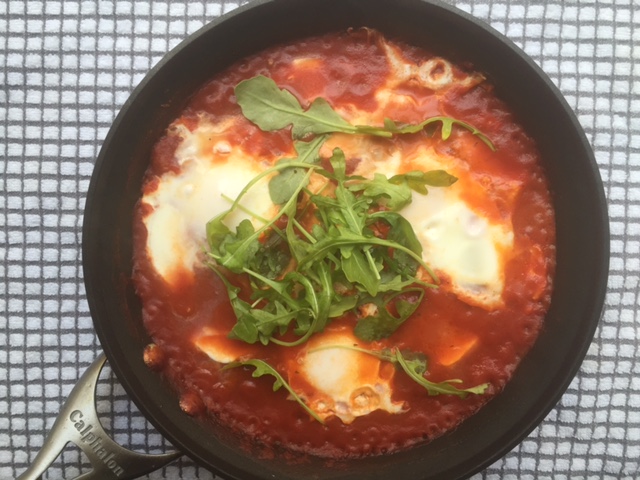 4) Once the eggs are cooked to the desired doneness, turn off the heat. Top the tomato and eggs with the arugula salad. Serve warm with a side of ricotta cheese and sliced baguette.