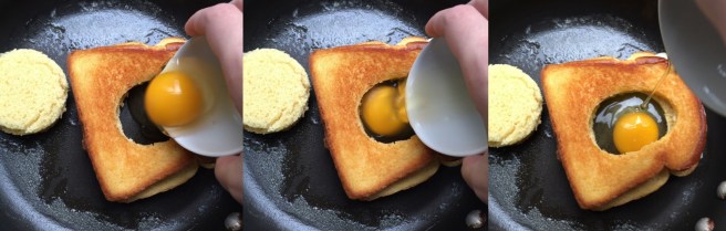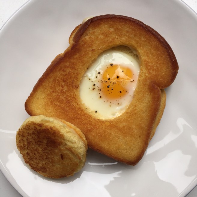 3) Add the butter to a medium, nonstick saute pan over low heat. (It’s important to keep the heat low or the sandwich will burn before the egg cooks completely.) Add the sandwich and cutout to the skillet and toast until golden brown. Flip the sandwich and cutout over with a spatula and gently pour the egg into to the center of the sandwich, making sure not to break the yolk. Season the egg with a pinch of salt and fresh black pepper. Cover the skillet with a lid and cook until the egg white had set and the underside is toasted, about 5 minutes. The cutout will cook faster than the sandwich, so check the underside regularly. Once cooked, transfer the sandwich and cutout to a plate and serve immediately.
