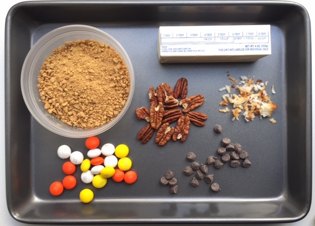 **Cook’s Note: If you plan to use other Halloween candy, it’s important to understand that some chocolate candies (like Reese’s Cups) and some sugary candies (like candy corn) will melt when baked in the oven. Suggested candies for magic bars are M&M’s, caramel candies, chocolate covered nuts/raisins, and Reese’s Pieces.