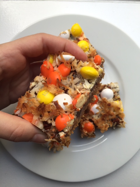 Magic bars are a classic bar-cookie that is both chewy and sweet. Usually magic bars are topped with butterscotch chips, chocolate chips and shredded coconut. But why not change things up for a fun Halloween twist? So use up your leftover candy from trick-or-treating and make these delicious magic bars for your next holiday costume party.
